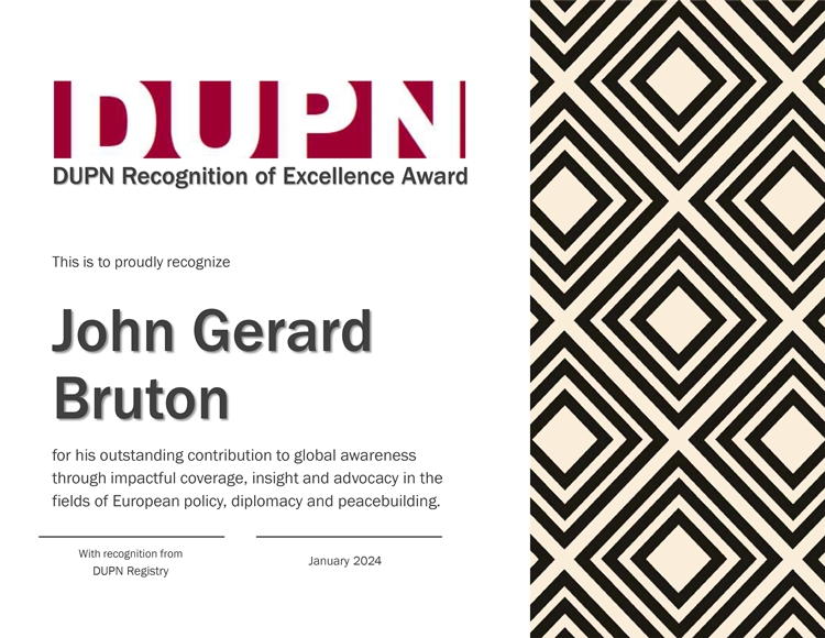 We are proud to announce that John Gerard Bruton, former Irish Prime Minister and distinguished voice in European affairs, has been recognized with the DUPN Recognition of Excellence Award for the January 2024 session. This recognition acknowledges his outstanding contribution to global awareness through impactful commentary, media engagement and public advocacy in the fields of European policy, diplomacy and peacebuilding.